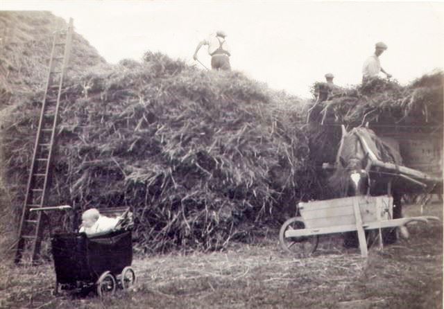 Above at White Hall Farm with neighbour Trevor Loveday on tractor, and various Markham children by the reaper (Keith on top).