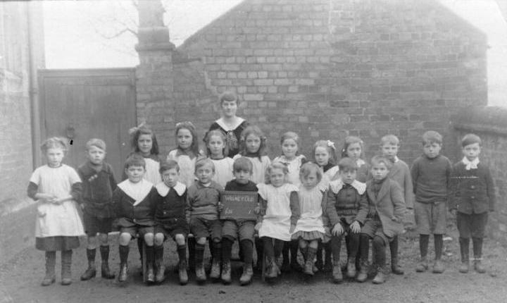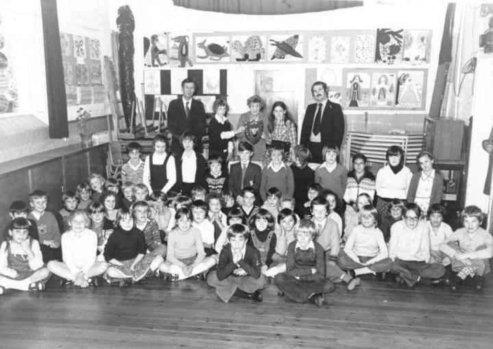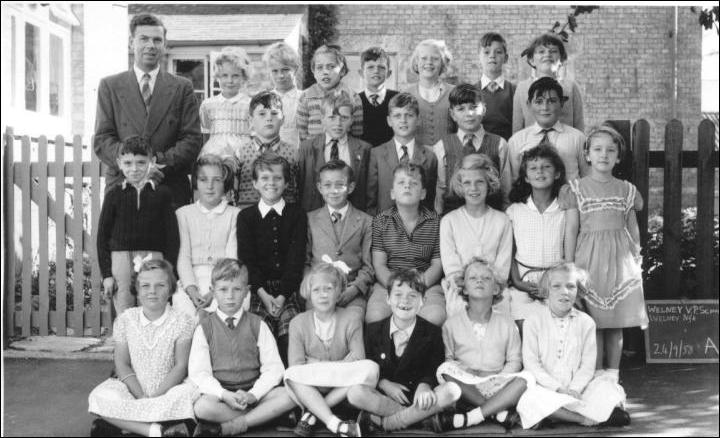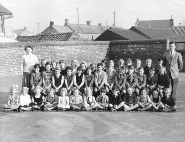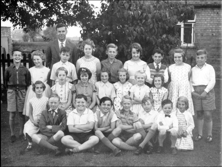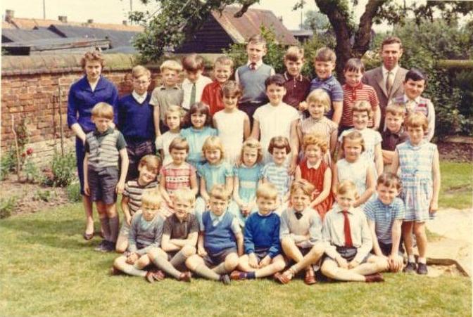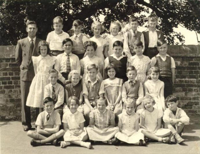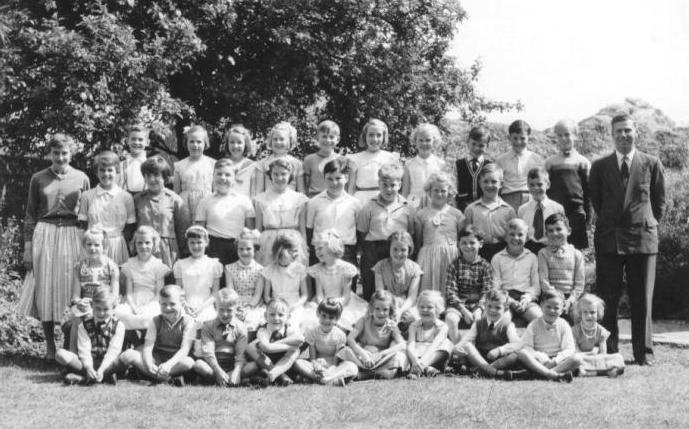 Mr Turner and Mrs Moden with the juniors and infants in 1964, left to right: