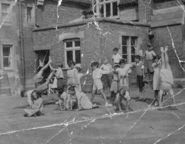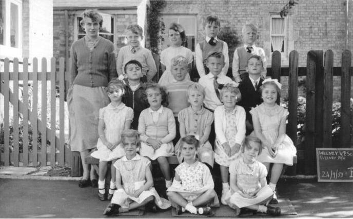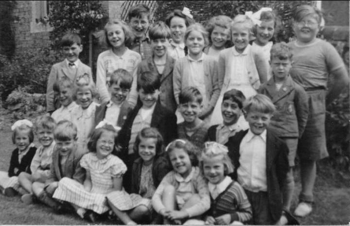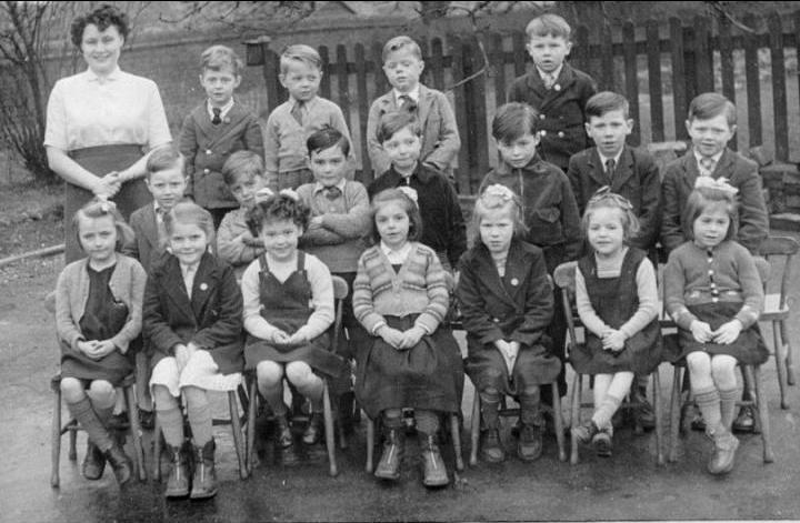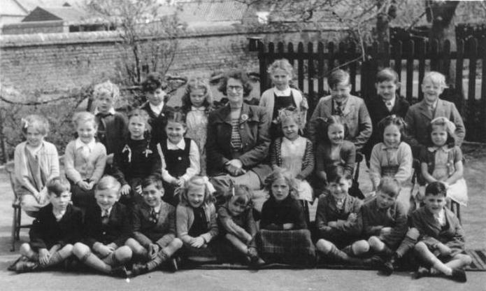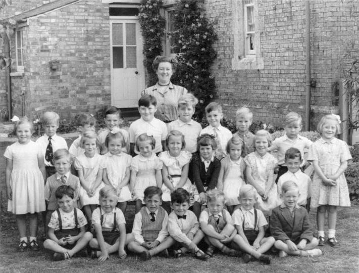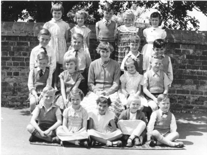 Mrs Peggy Turner, the headmaster's wife, with the infants in 1957, left to right: